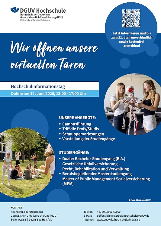 Sie haben Interesse an einem dualen Bachelorstudiengang oder nehmen den "Dualen Bachelor-Studiengang (B.A.) Gesetzliche Unfallversicherung – Recht, Rehabilitation und Verwaltung" an der Hochschule der Deutschen Gesetzlichen Unfallversicherung in Bad Hersfeld im Herbst 2026 auf?